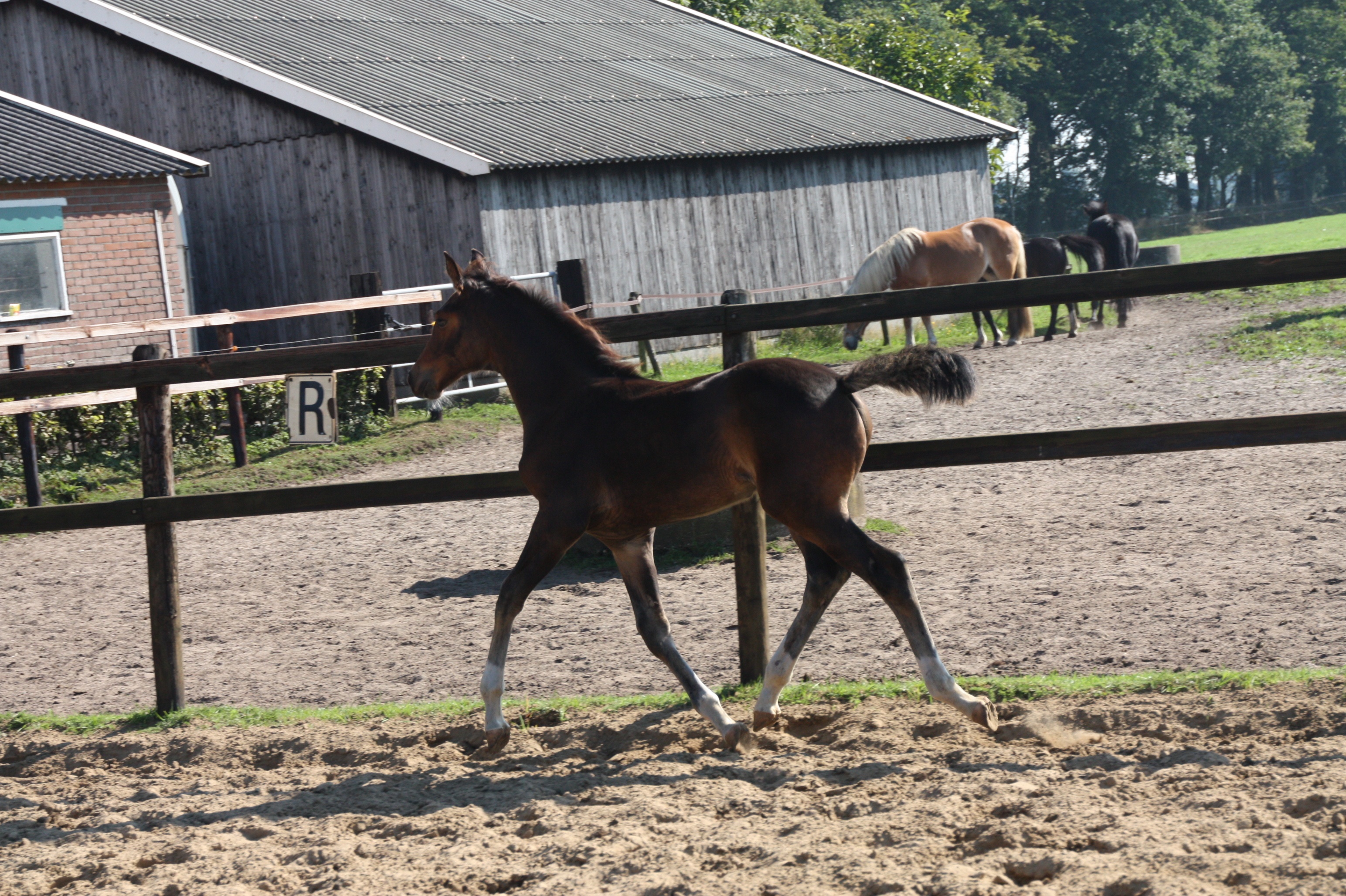 DarwinGeb. datum 9-apr-1985Roemer X Pion ![]() Verrichting Ermelo 1988 Zeer evenwichtig, eerlijk met goed humeur, vriendelijk, gehoorzaam en attent. Bij begin onderzoek zadelmak. Heeft drie goede basisgangen met veel tact en regelmaat. Stap ruim en krachtig. Draf mooi gedragen, ruim en regelmatig. Galop goed gedragen met veel regelmaat en ruimte. Toont bij springen voldoende ruggebruik, presteert voldoende. In terrein betrouwbaar. Veel bereidheid om te werken, werkt met plezier, ervaart werk als licht. Ruim voldoende aanleg als spring- en terreinpaard, veel aanleg als dressuurpaard. Bij aankomst goede voedingstoestand die hetzelfde bleef. Eet normaal. Stro in zijn box vervangen door houtkrullen. Rustig stalgedrag. ![]() Afstammelingen 1990 (veulens) Deze hengst presenteerde een collectie royaal ontwikkelde, voldoende rijtypisch gebouwde veulens. Het hoofd is op zichzelf redelijk correct gebouwd, is echter iets lang en zou sprekender kunnen zijn, terwijl het oog weinig uitdrukkingsvol is; tussen de ogen is de neuslijn nog wel eens iets gewelfd. De hals heeft veel lengte, is goed gevormd en staat er goed op. De schoft is zeer lang en goed ontwikkeld. De schouder heeft veel lengte en vertoont doorgaans de goede ligging. De rug is meermalen lang en ook nog wel eens iets gezonken. De lendenen zijn goed aangesloten en gespierd. De croupe kon typischer en langer; de staart ligt er vaak hoog in. Het voorbeen is goed gesteld, goed ontwikkeld en meermalen lang gekoot. Het achterbeen is vaak lang en ook daar treffen we dikwijls een lange koot aan. De gewrichten zijn over het algemeen fors ontwikkeld. De stap gaat de veulens gemakkelijk af en daarbij ruimen ze voldoende. In draf is er sprake van ruimte, balans en oprichting, maar doorgaans zou het achterbeen effectiever onder moeten treden. Enkele veulens bewogen zich echter superieur; een groot aantal had de neiging om de staart omhoog te steken en overmoedig rond te walsen. 1997 november export naar USA 2002 december overleden; diepvriessperma blijft beschikbaar. ![]() |